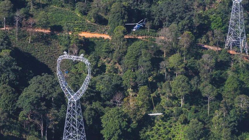 在中老500千伏联网工程(国内段)施工现场,建设团队采用“无人机+直升机”吊运电力物资,保护热带雨林生态环境。云南电网供图