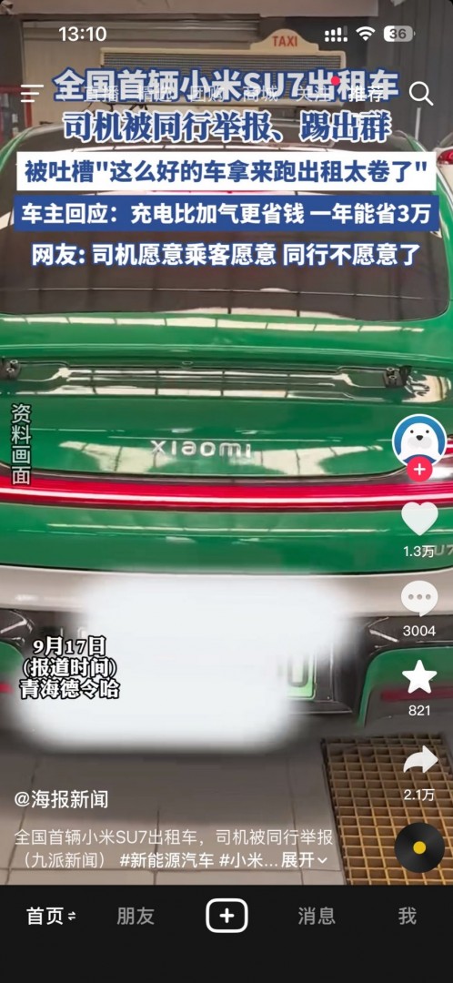 据媒体报道,近日全国第一辆小米SU7出租车,在青海德令哈完成喷漆投入运营。不过,车主表示,车辆运营第一天,遭到同行举报,同时被踢出了司机群。