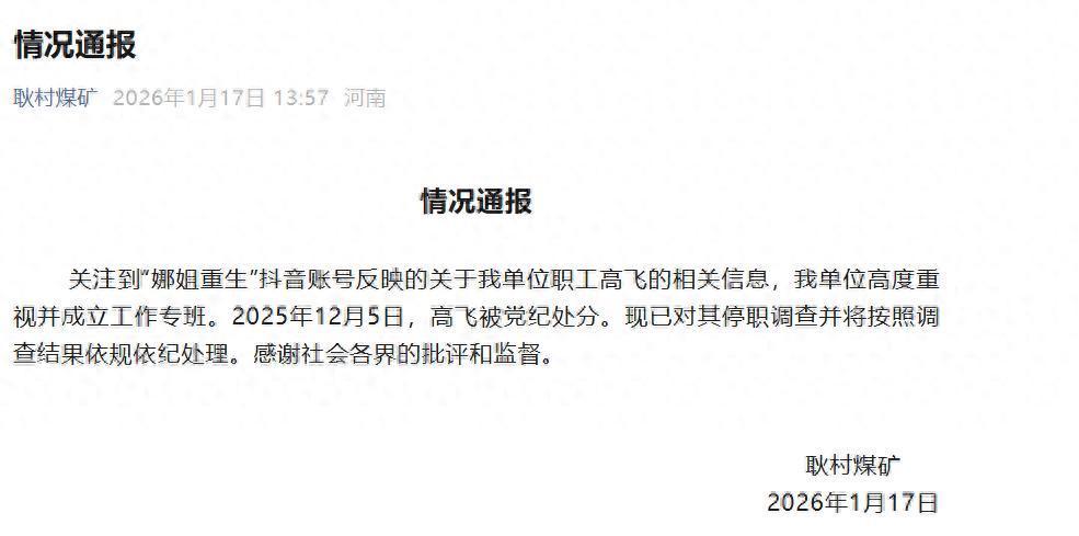 关注到“娜姐重生”抖音账号反映的关于我单位职工高飞的相关信息,我单位高度重视并成立工作专班。2025年12月5日,高飞被党纪处分。现已对其停职调查并将按照调查结果依规依纪处理。感谢社会各界的批评和监督。